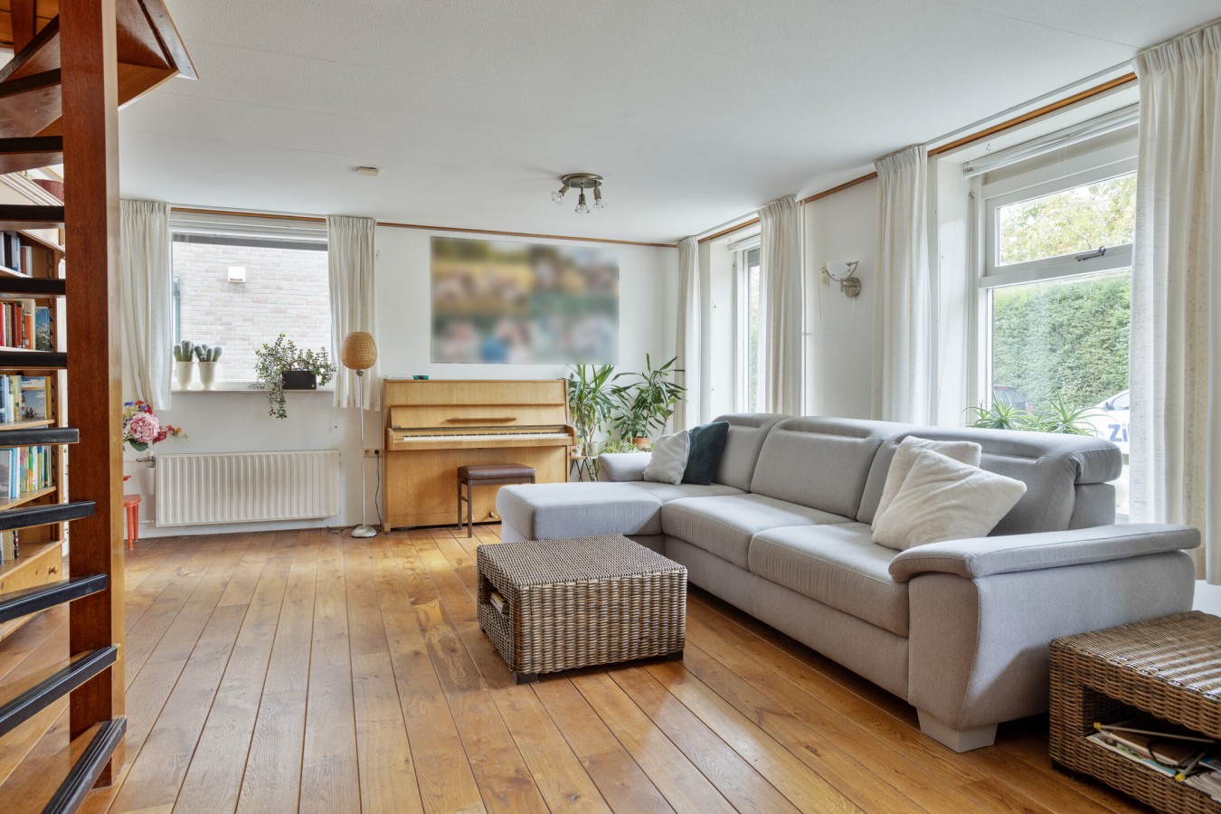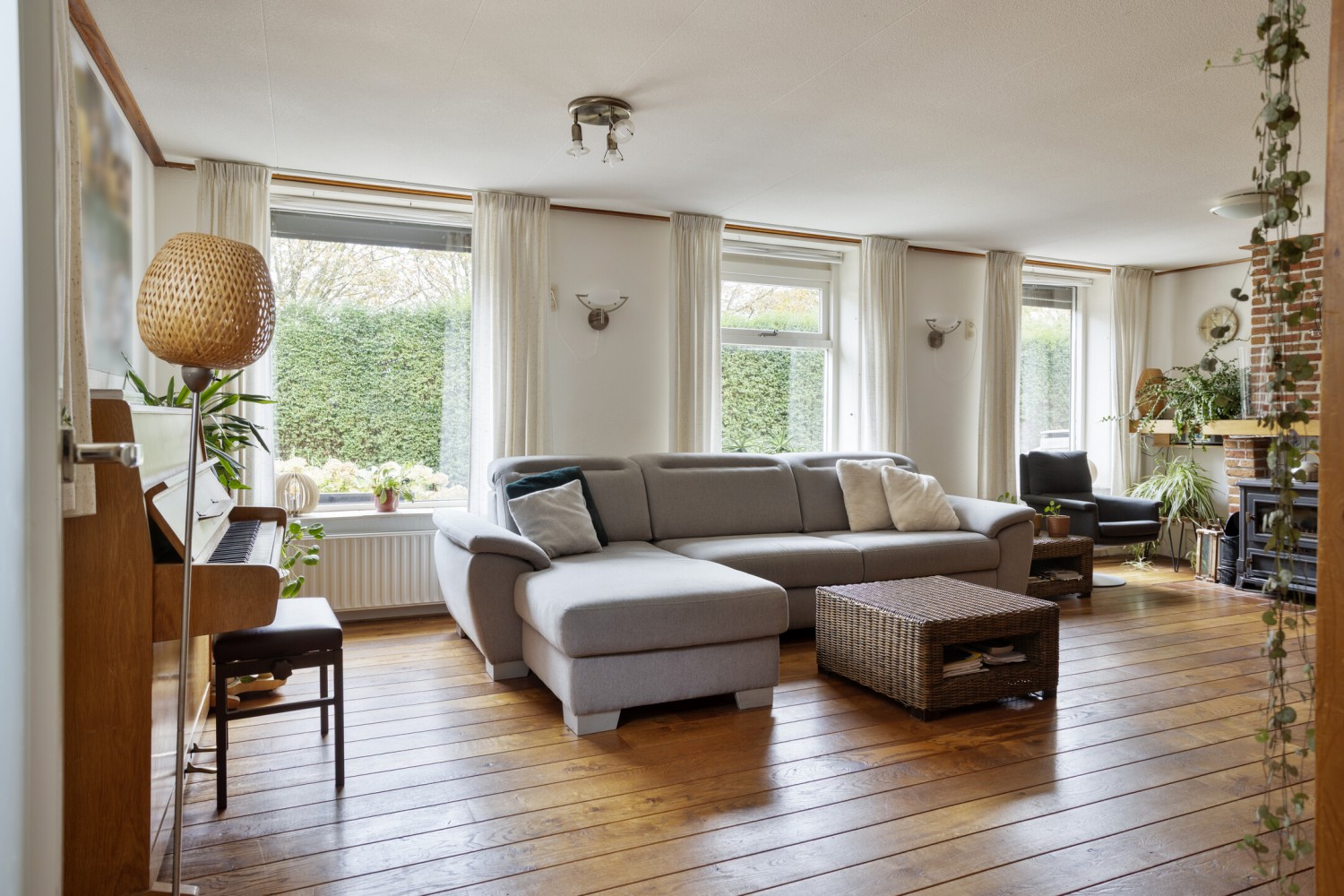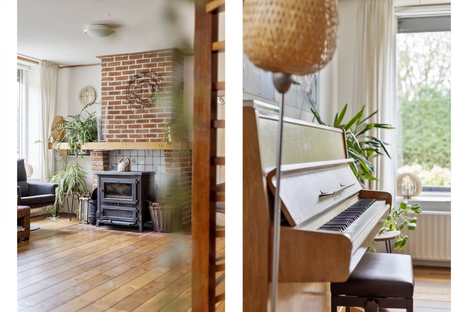 Bij binnenkomst tref je de hal met meterkast, toilet met fonteintje en toegang tot de keuken en woonkamer. De lichte woonkamer met gezellige haard nodigt uit om te ontspannen en geeft toegang tot de trap naar de verdieping. De woonkeuken is van alle gemakken voorzien met inbouwapparatuur, inclusief Quooker, en grote raampartijen die prachtig uitzicht geven op de tuin. Vanuit de keuken kom je bij de badkamer, uitgerust met douche, wastafel en witgoedaansluiting, en bij de provisiekast voor extra opbergruimte.