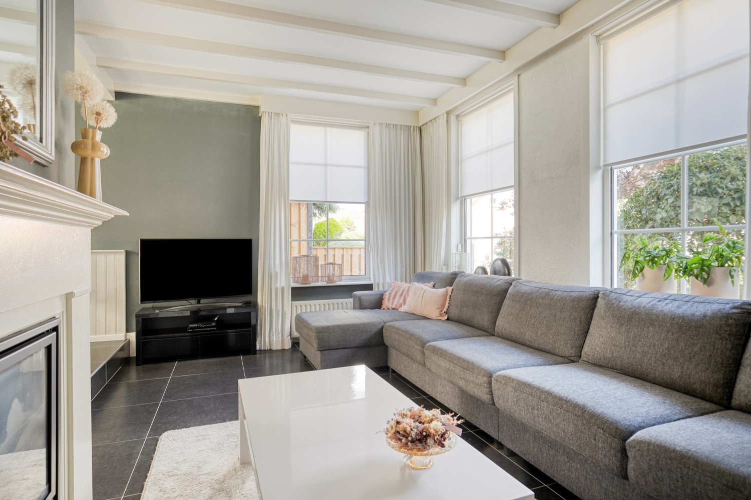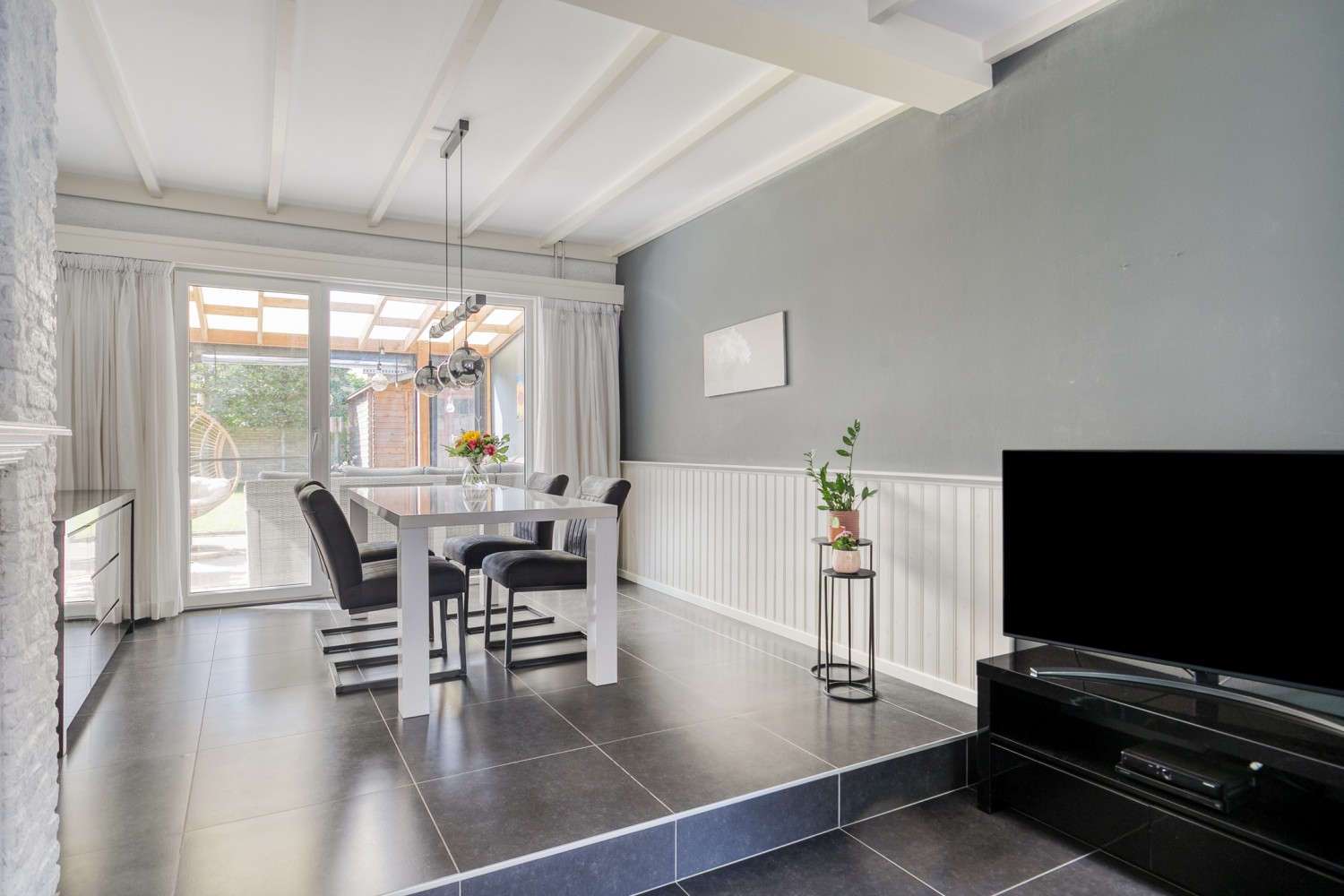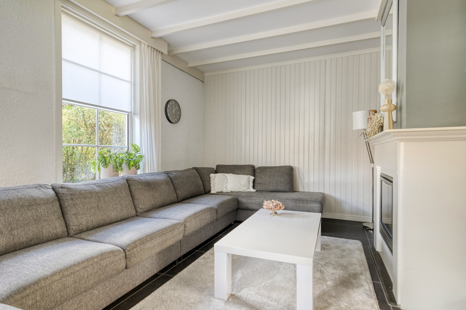De woonkamer is licht en uitnodigend en voorzien van een sfeervolle gashaard, nette tegelvloer en grote raampartijen, die zorgen voor veel lichtinval. Via de loopdeur aan de achterzijde bereik je de achtertuin, waarbij je direct onder de gezellige, afsluitbare overkapping komt. Een heerlijke plek om elk moment van de dag te genieten! De tuin, met eigen achterom, sluit daar prachtig op aan. Verzorgd, overzichtelijk en ingericht met een terras, gazon en diverse plantenborders. Achterin de tuin staat een houten berging. Vanuit de tuin heb je ook toegang tot garage met oprit.