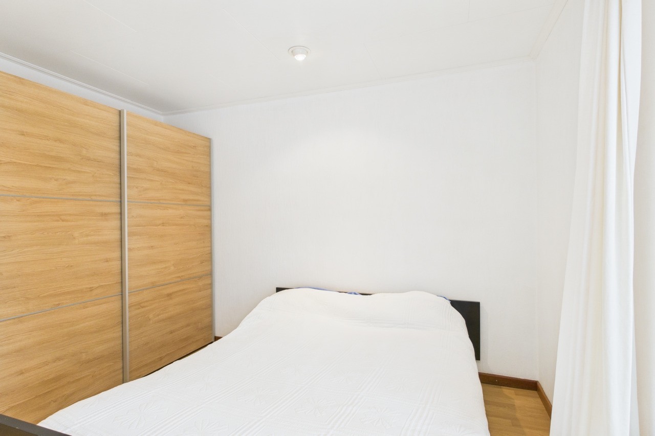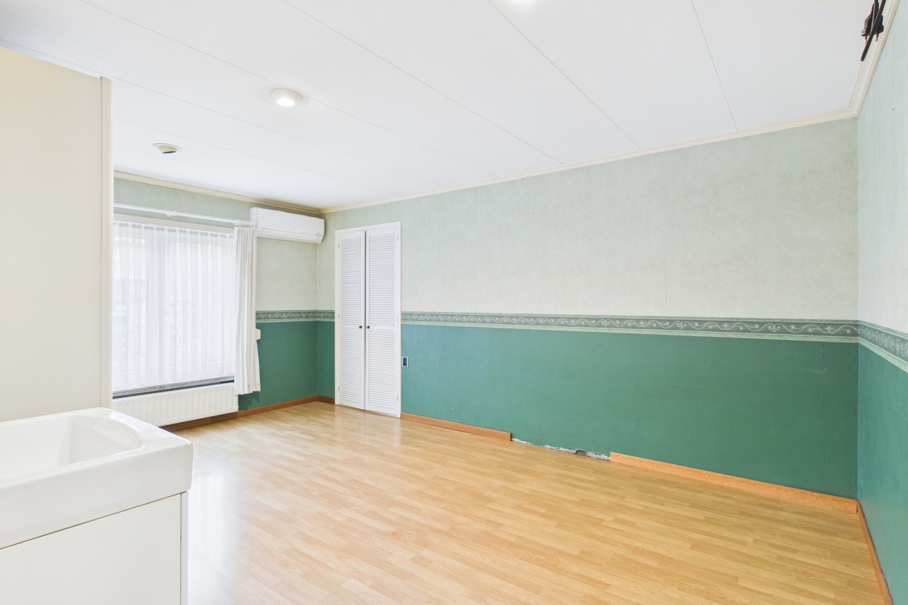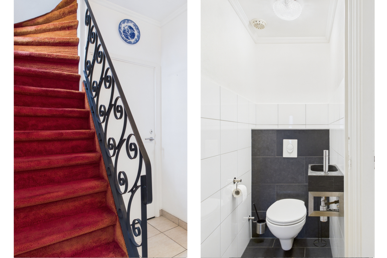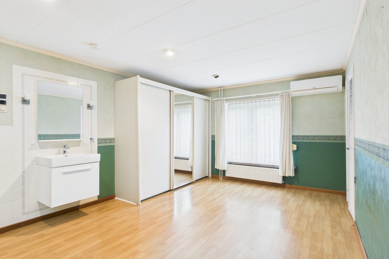 Op de eerste verdieping bevinden zich drie slaapkamers en de badkamer. Aan de voorzijde ligt een middelgrote slaapkamer, aan de achterzijde een tweede ruime kamer en daarnaast de royale master bedroom met eigen wastafel, inbouwkast en airco. Ook vind je op deze verdieping een apart toilet en de nette badkamer met douche en wastafel.