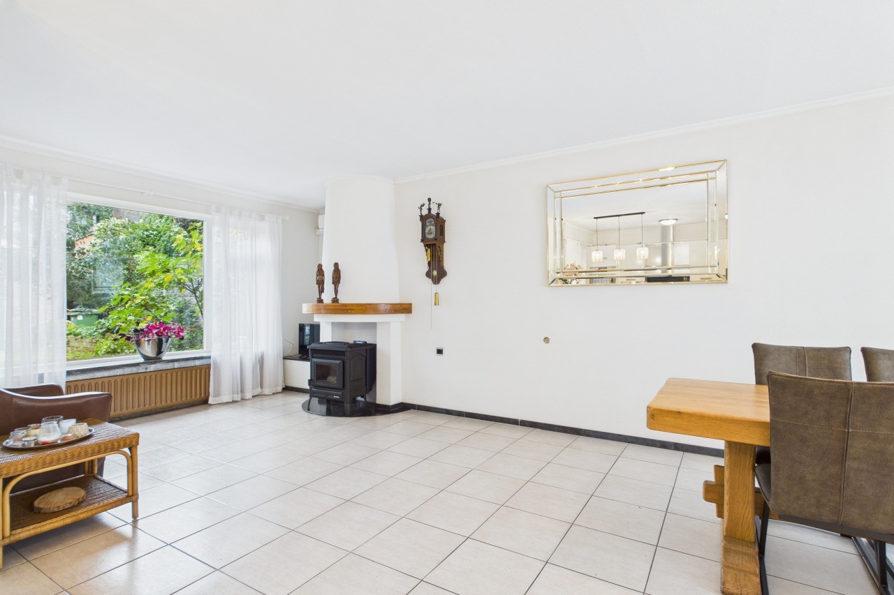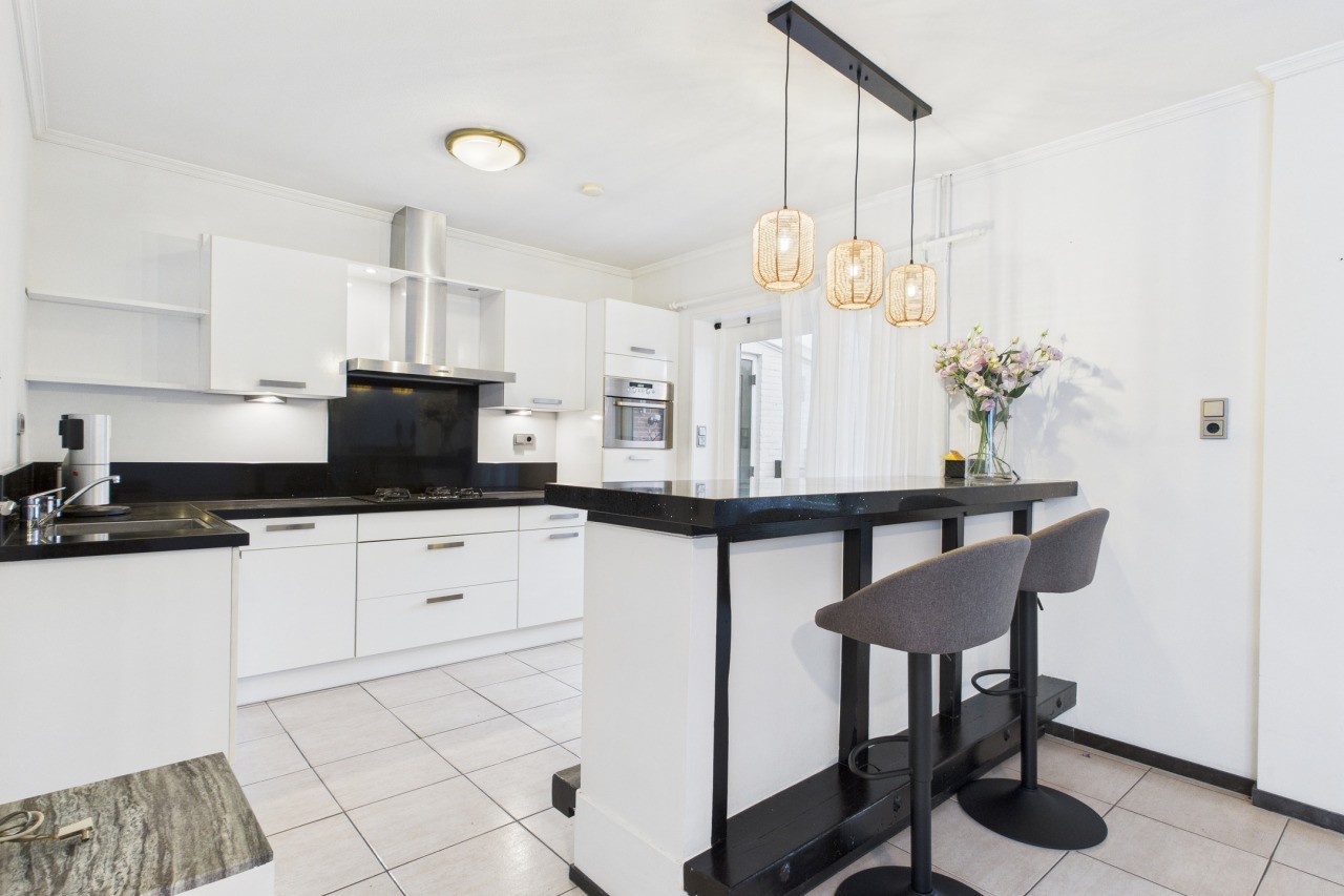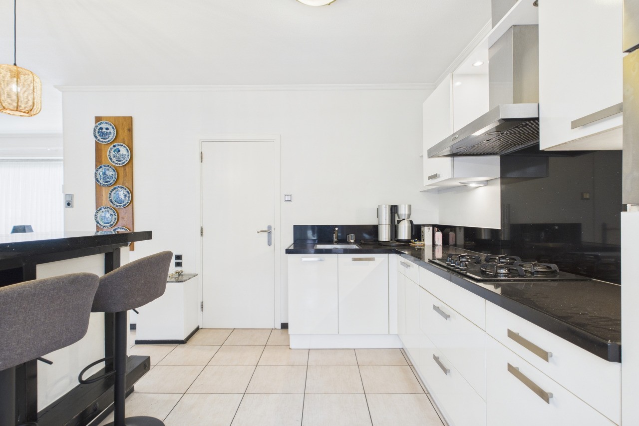 De hal met tegelvloer geeft toegang tot het toilet, de meterkast en de trap naar de verdieping. Via de hal loop je door naar de open keuken, die in een hoekopstelling is geplaatst en voorzien is van alle gemakken, waaronder een 4-pits gasfornuis, vaatwasser, koelkast en combi-oven. De bar vormt een gezellige plek voor een snelle koffie of een goed gesprek tijdens het koken. Vanuit de keuken stap je rechtstreeks de tuin in. De woonkamer is opvallend licht en sfeervol, mede dankzij de pelletkachel en de airco die zorgt voor een aangenaam binnenklimaat in elk seizoen.