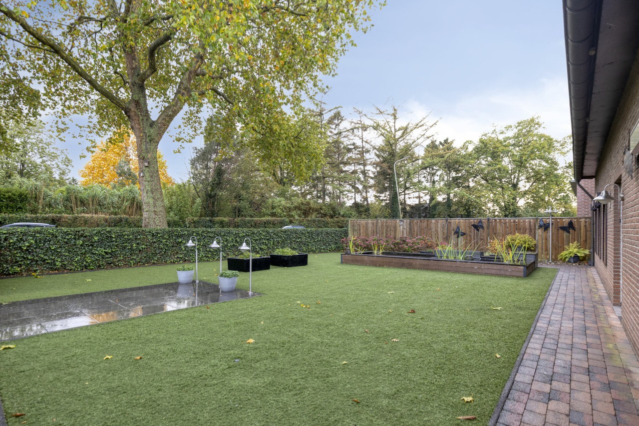 De tuin bevindt zich voornamelijk aan de voorzijde van de woning en biedt een prettige plek om van de zon te genieten of te ontspannen in de schaduw. Met een gazon, groenbeplanting en verschillende zitmogelijkheden is het een uitnodigende buitenruimte, terwijl de woning toch beschut en vrij ligt ten opzichte van de straat.