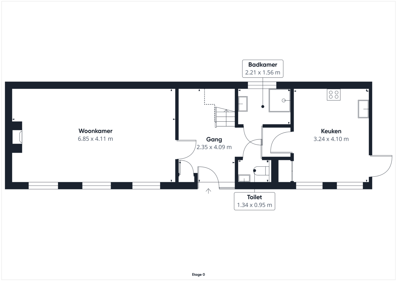 Bij binnenkomst betreed je de centraal gelegen hal, die toegang biedt tot de meterkast, de trapopgang naar de eerste verdieping, de woonkamer aan de linkerzijde en de badkamer, het separate toilet en de keuken aan de rechterzijde. Vanuit de hal is tevens de kelder bereikbaar, welke geheel betegeld is. De lichte woonkamer met gezellige haard vormt het hart van het huis en nodigt uit tot ontspannen. De ruime keuken biedt voldoende plek voor een eethoek en is voorzien van inbouwapparatuur. Ook is er een handige voorraadkast aanwezig als aanvulling op de bergruimte. Vanuit de keuken is er een directe doorgang naar de achterzijde van het perceel. De badkamer beschikt over een wastafel en een douche, terwijl het separate toilet is uitgerust met een fontein.