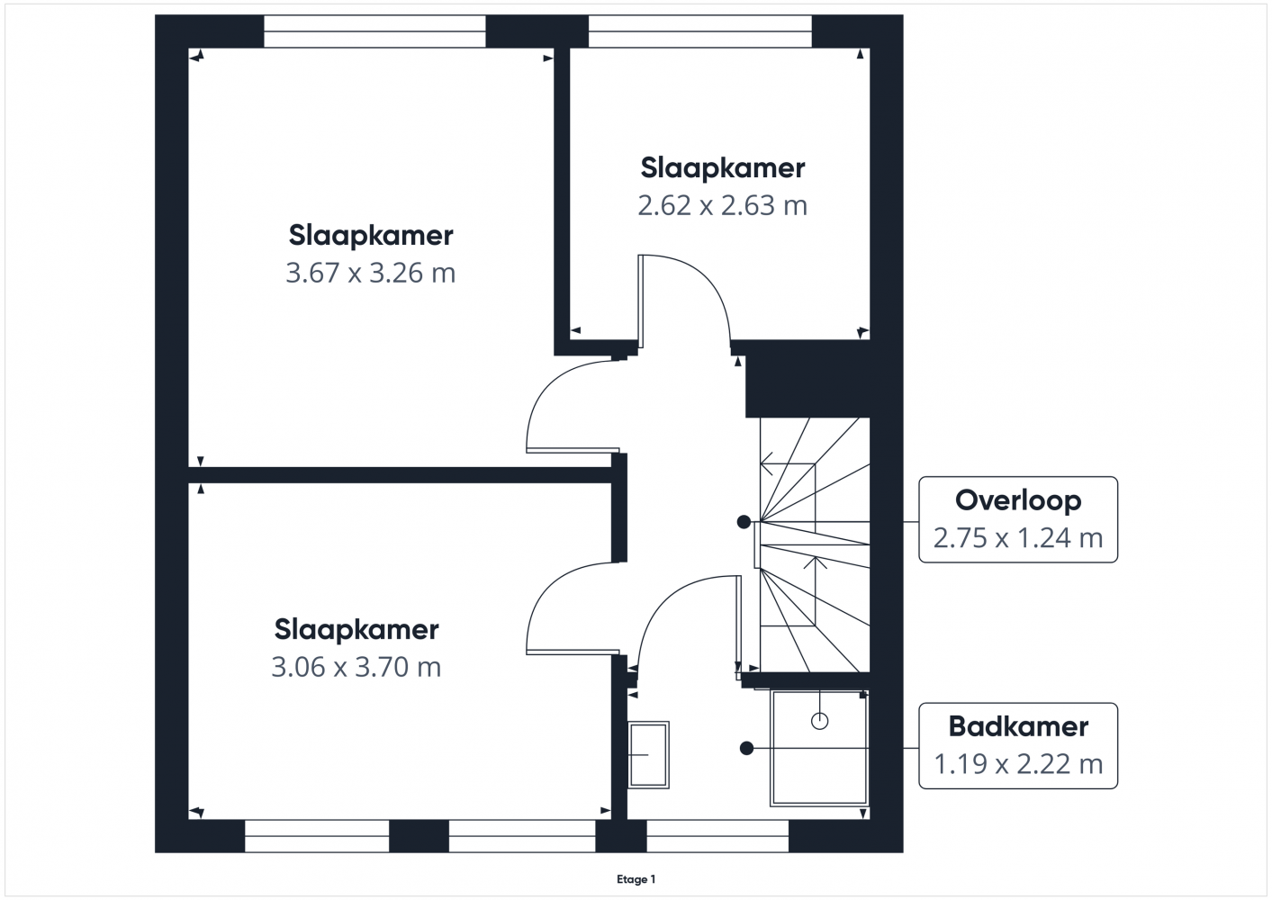 Op de eerste verdieping ligt een overloop met vaste trap naar de tweede verdieping. Hier bevinden zich drie slaapkamers, elk netjes afgewerkt en met veel lichtinval. De tweede badkamer is uitgerust met een douche en wastafel, voor extra comfort in het dagelijks gebruik.