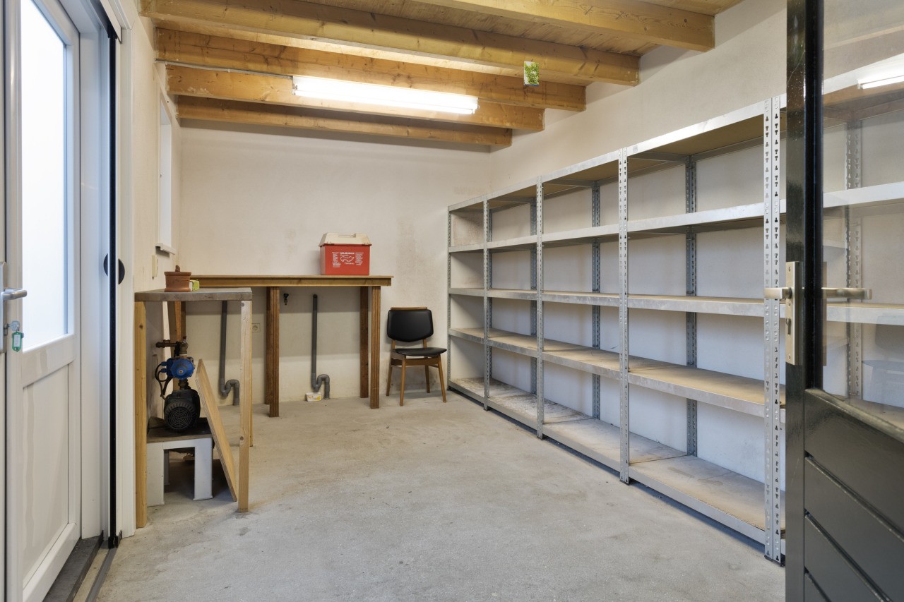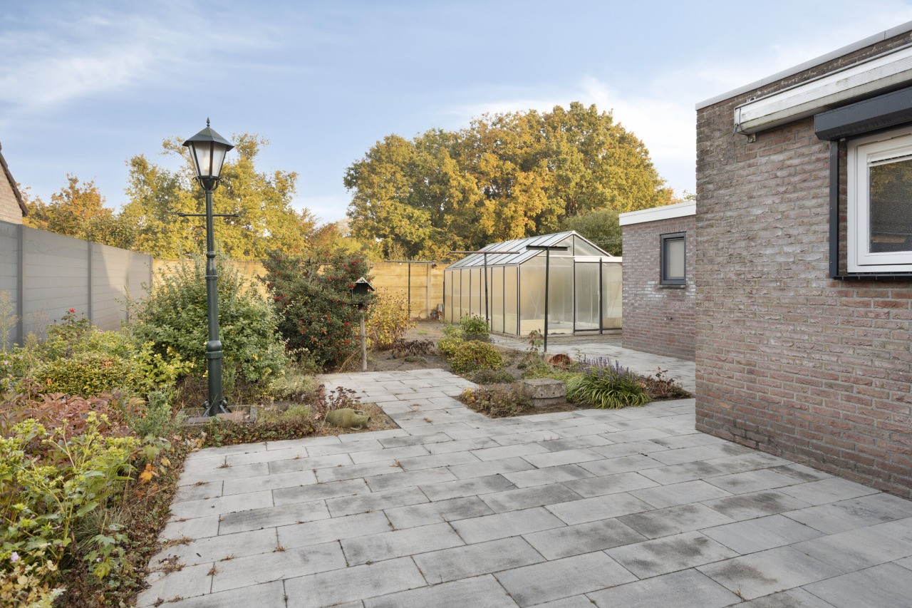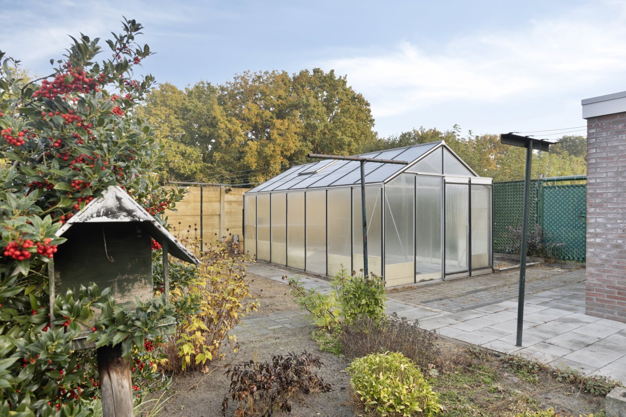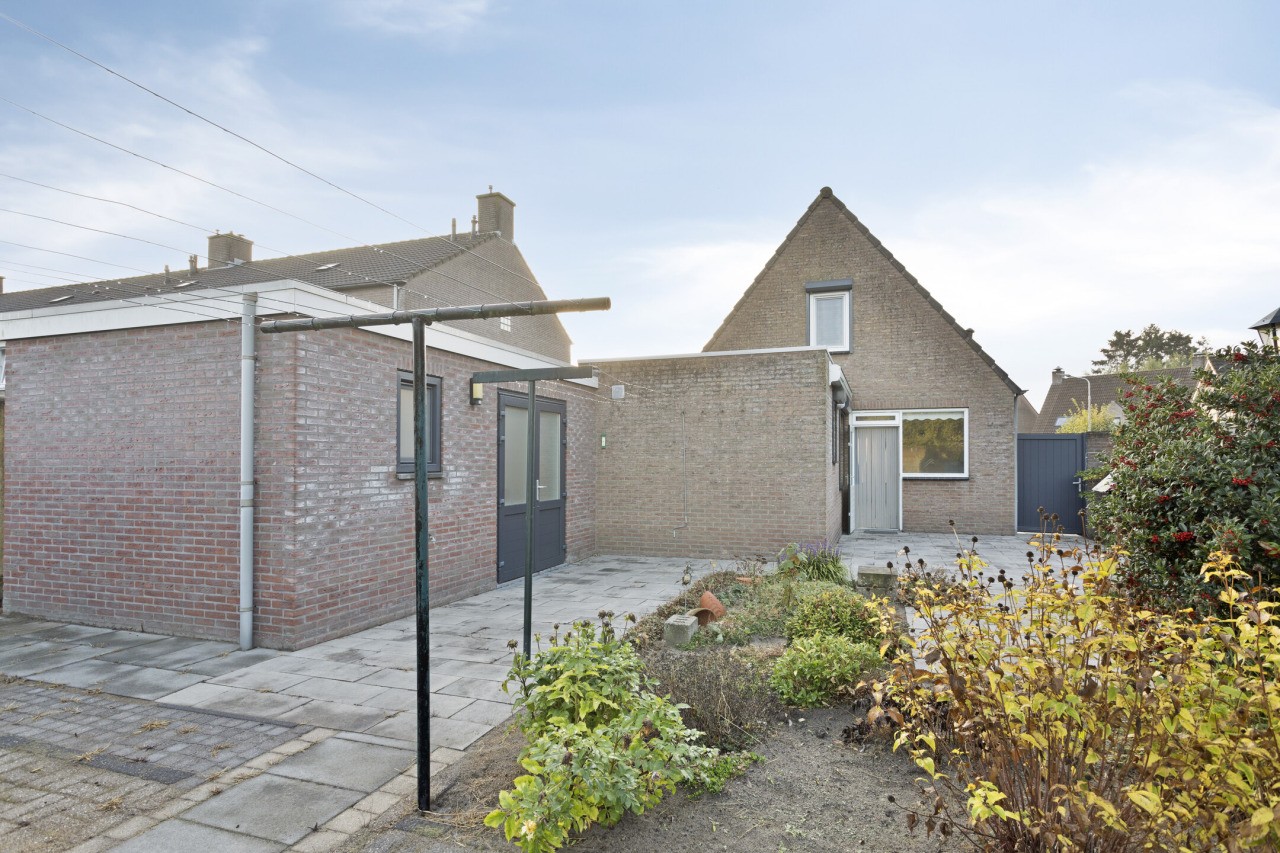 De zonnige tuin rondom de woning is een fijne plek om buiten te zijn. Met een netjes aangelegd terras en zorgvuldig onderhouden borders voelt het hier prettig en verzorgd. Dankzij de vrije achterom is de tuin makkelijk bereikbaar, en de ligging op het westen zorgt voor middag- en avondzon. De aangebouwde stenen garage en de berging daarachter bieden veel praktische ruimte, ideaal voor fietsen, gereedschap of opslag.
