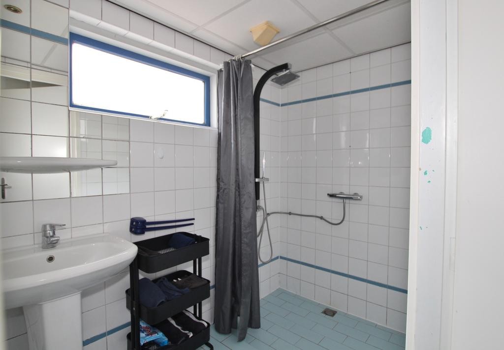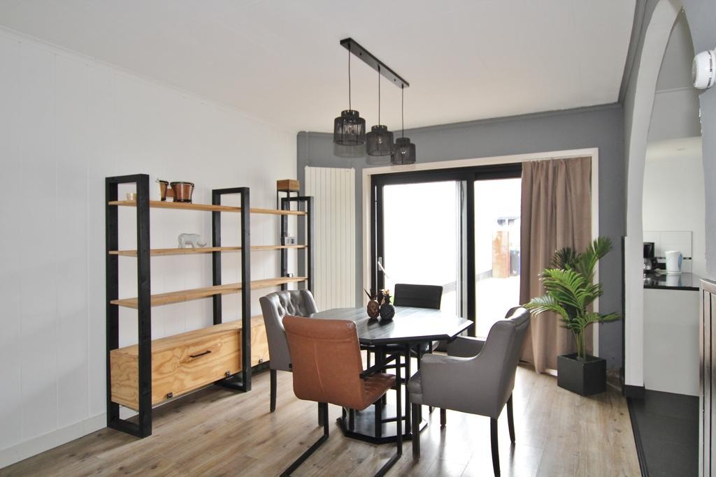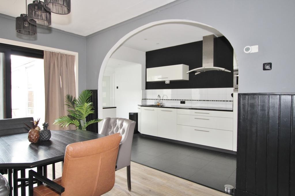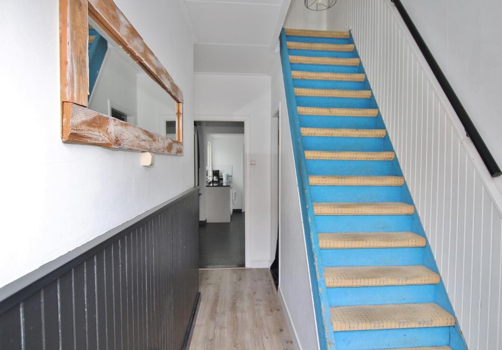 Hal met trap naar de eerste verdieping en trap-/kelderkast, sfeervolle woonkamer met schuifpui, open keuken met modern keukenblok met inbouwapparatuur (keramische kookplaat, afzuigkap, combi-magnetron, vaatwasser, koelkast en diepvries),halletje met achterdeur, apart toilet, volledig betegelde badkamer met douche en wastafel en een betegelde binnentuin.