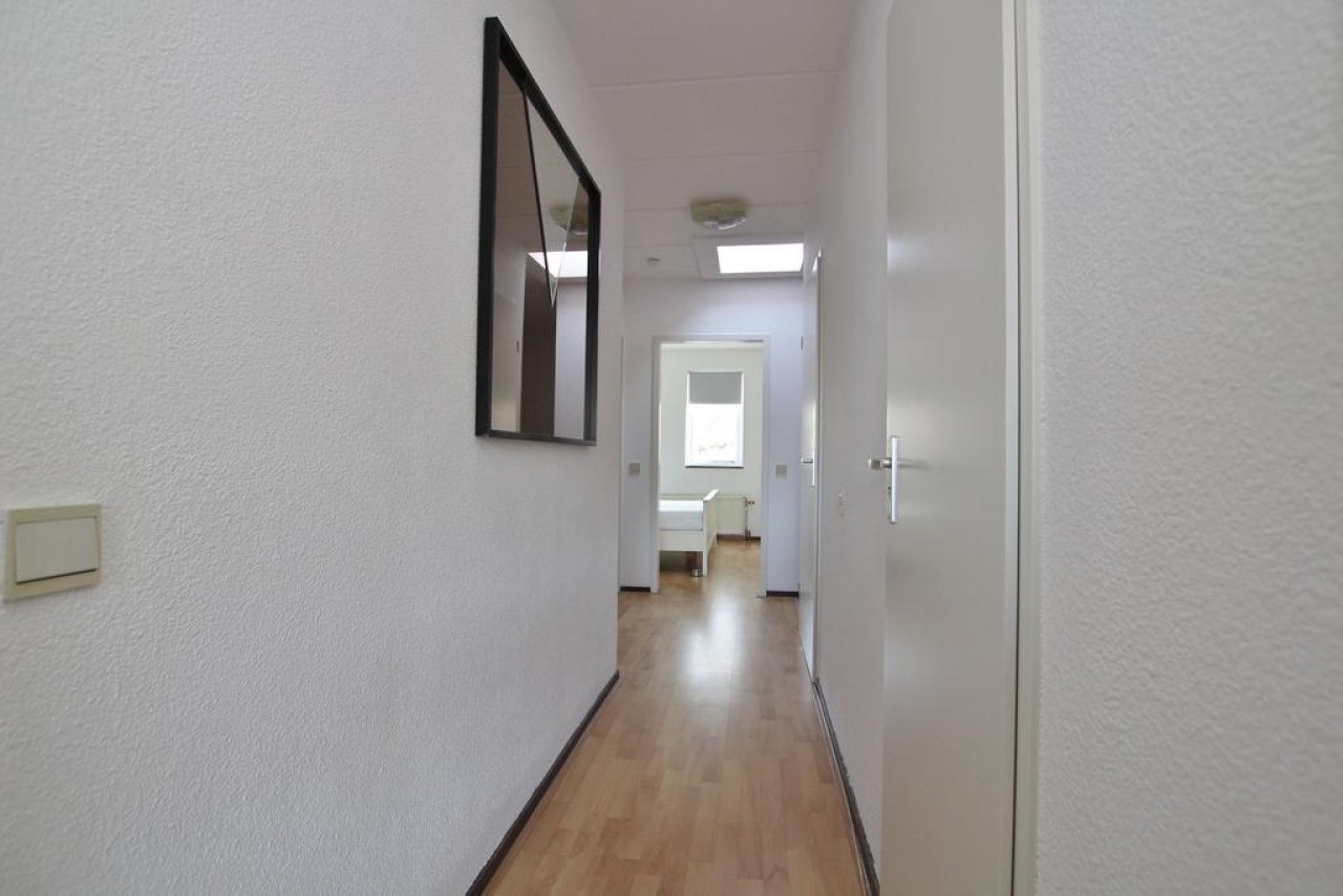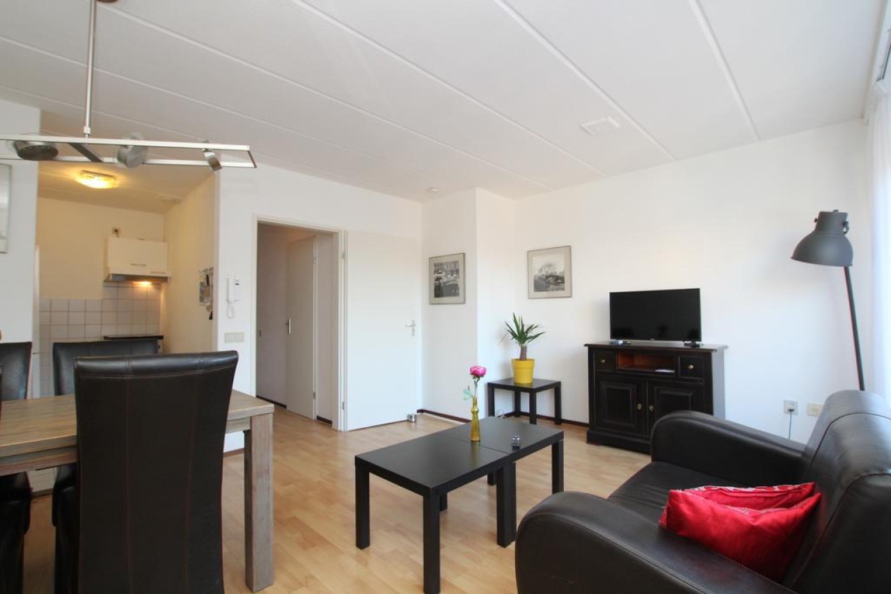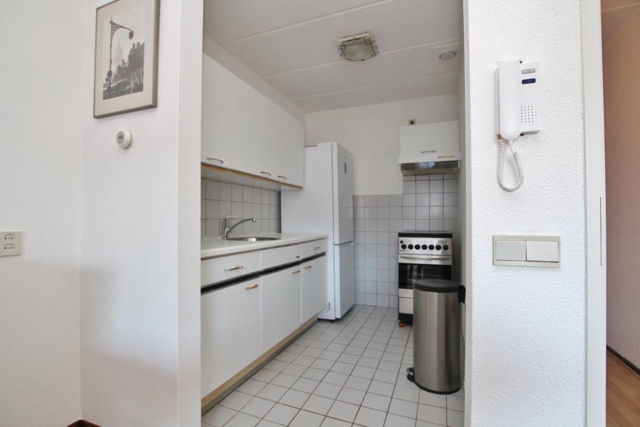Hal, toilet met fonteintje, wasruimte, volledig betegelde badkamer met douche en wastafel, slaapkamer met 2-persoonsbed, lichte woonkamer met toegang tot balkon, half open keuken met net keukenblok voorzien van een 4- pits gasstel, afzuigkap, oven, koelkast en vriezer.