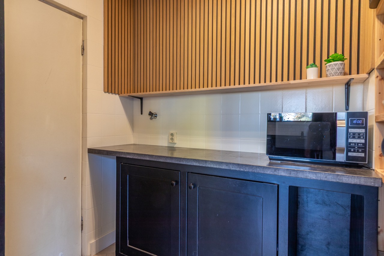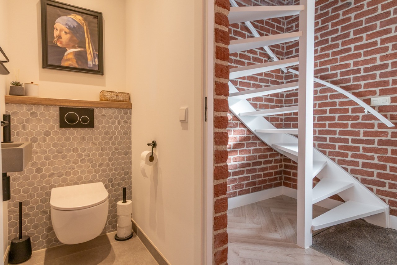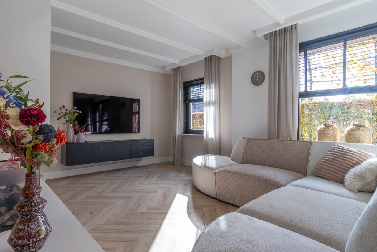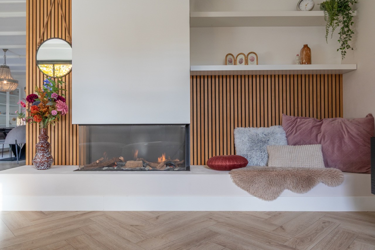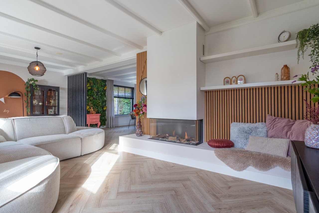 Bij binnenkomst in de hal valt direct de verzorgde uitstraling op. Vanuit hier bereik je de trapopgang, de meterkast en een modern toilet met fonteintje. De L-vormige doorzonwoonkamer voelt licht en ruim aan, met een sfeervolle sierhaard en een eethoek met prachtig uitzicht op de achtertuin. De zwarte U-keuken is van alle gemakken voorzien en biedt toegang tot de bijkeuken, die weer doorloopt naar de inpandige garage ? ideaal voor fietsen, opslag of een extra werkruimte.